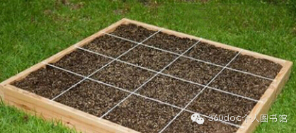 将木板条或绳子固定在木框上,将小菜地划成4行4列,总共16小格。注意木板条或绳子只是把菜地表面划成格子,并没有把下面的土隔开。